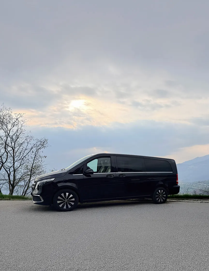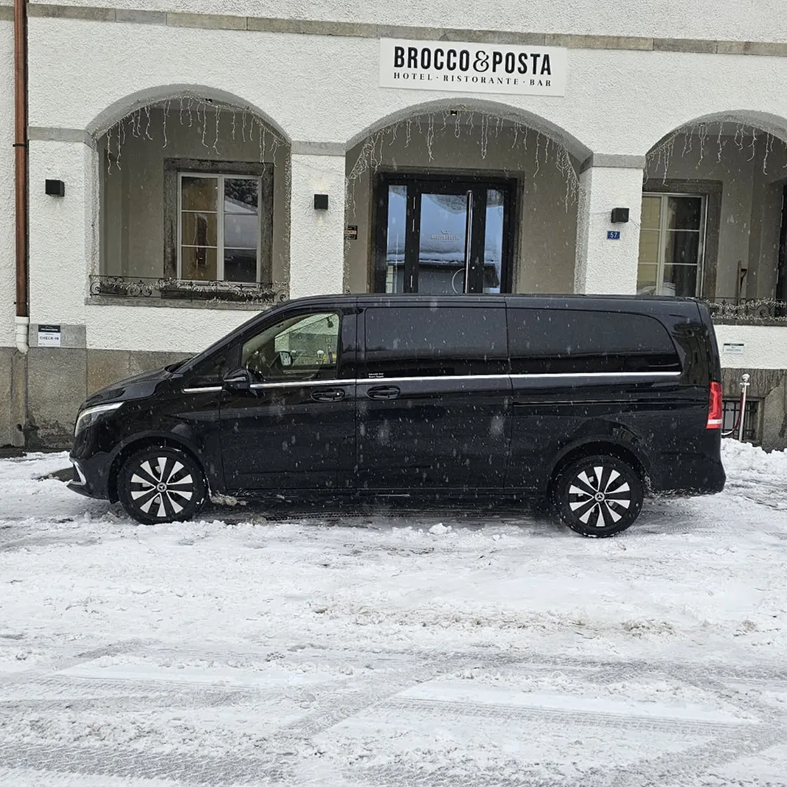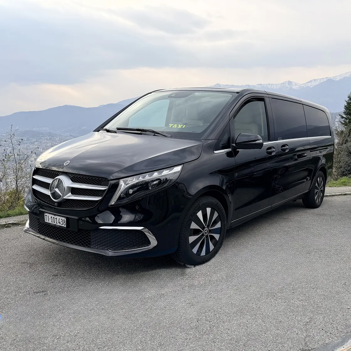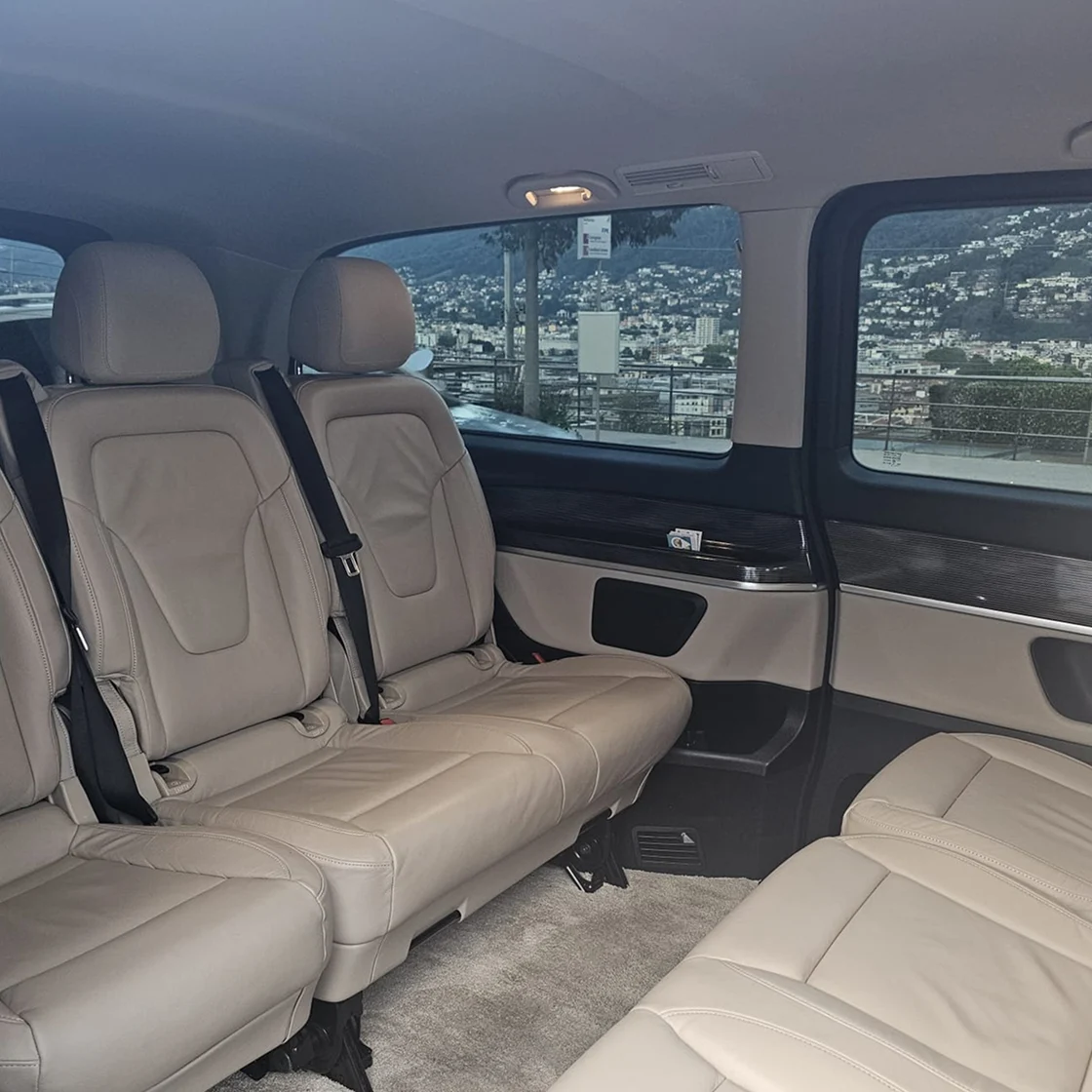 Trasporto fino a 7 passeggeri su van Mercedes-Benz con autista professionista. Un solo prezzo per tutti, spazio per i bagagli, comfort premium e flessibilità totale dal Ticino verso qualsiasi destinazione.
